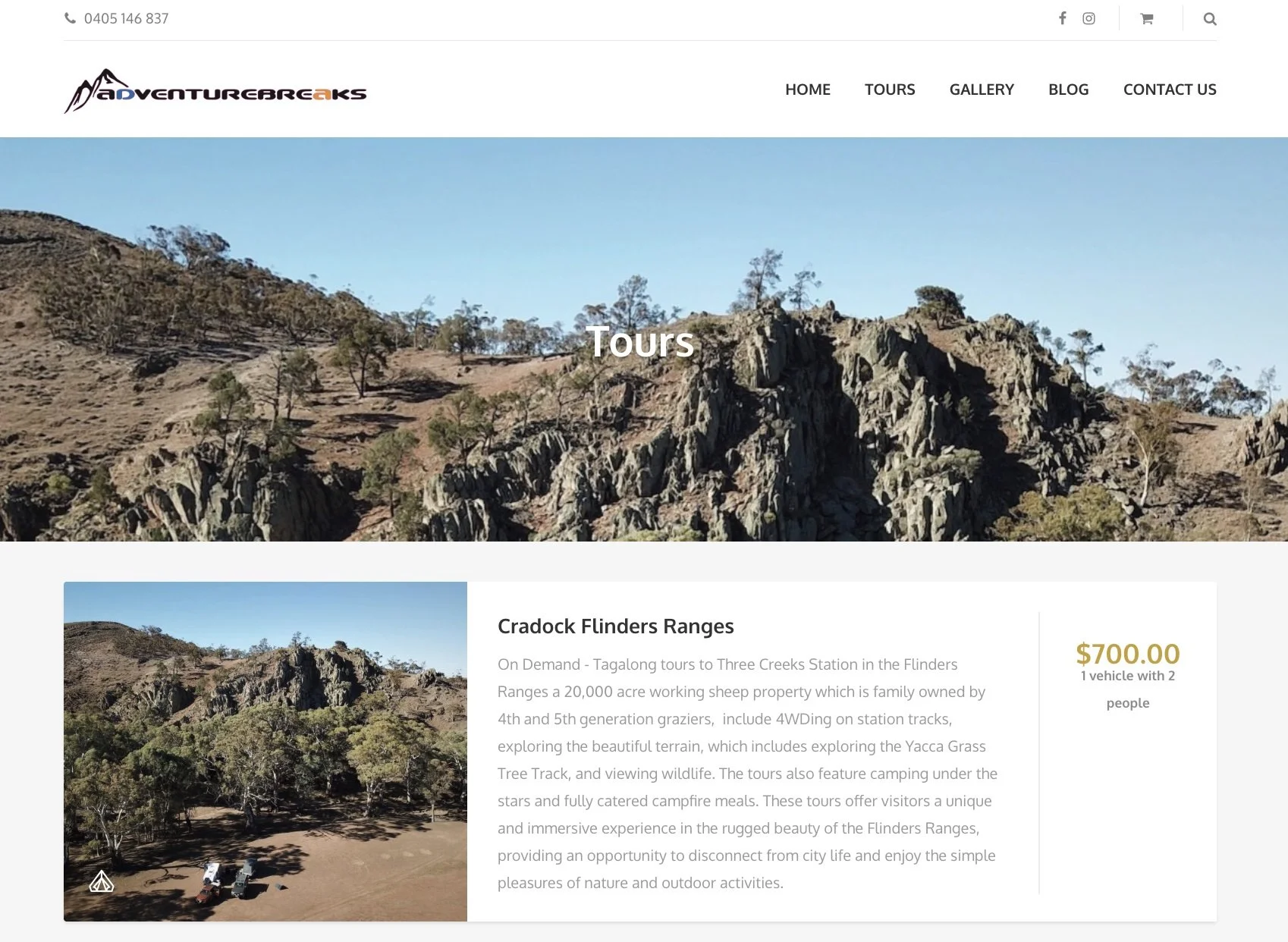Adventure Breaks, South Australia used Llamablue's expertise to design their Wordpress website with a focus on tours and a booking system, linking with socials Facebook and Instagram.